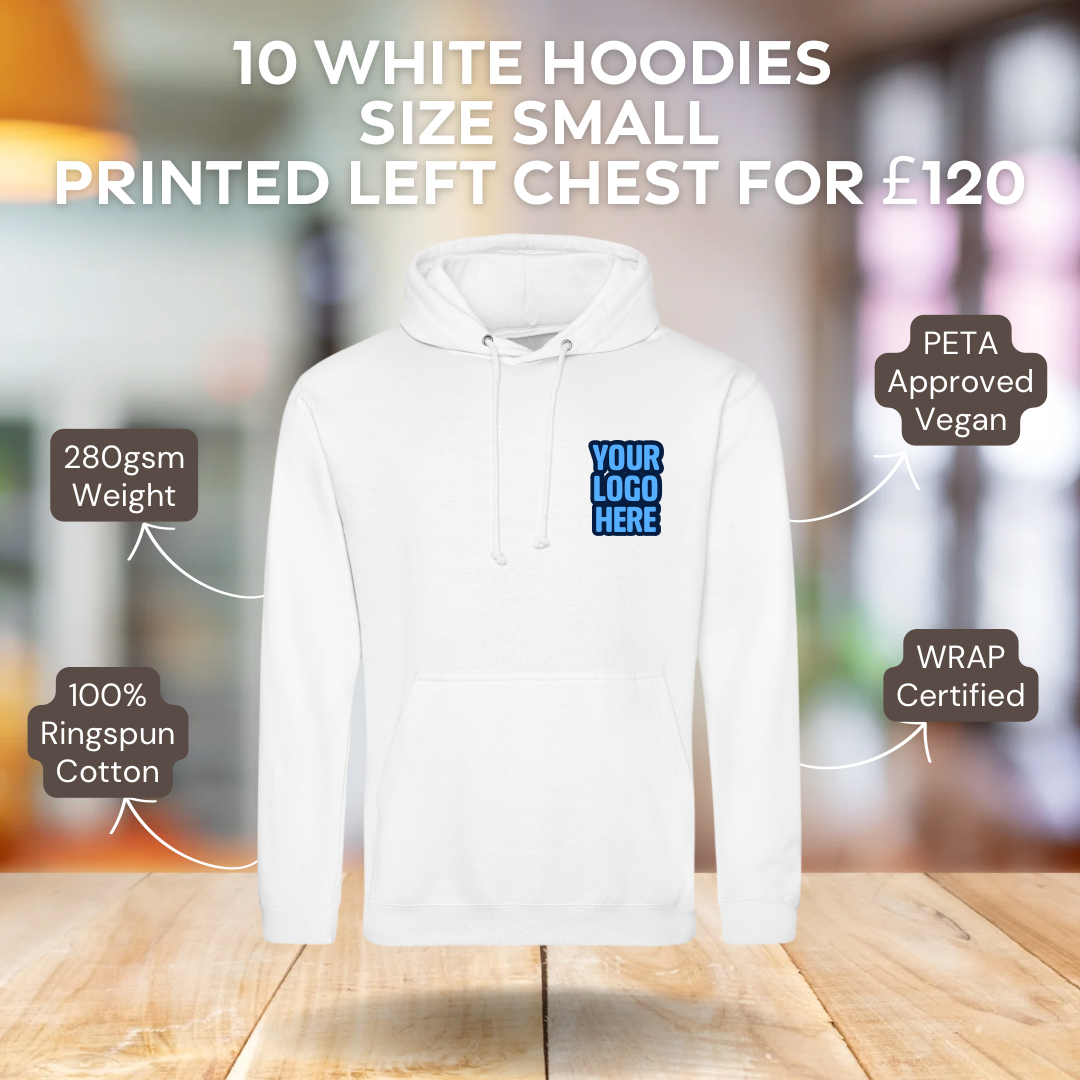 *pack includes 10 x Arctic White size small hoodies. each hoodie is DTF printed with 1 logo (same logo on each hoodie) up to a size of 15cm x 15cm.